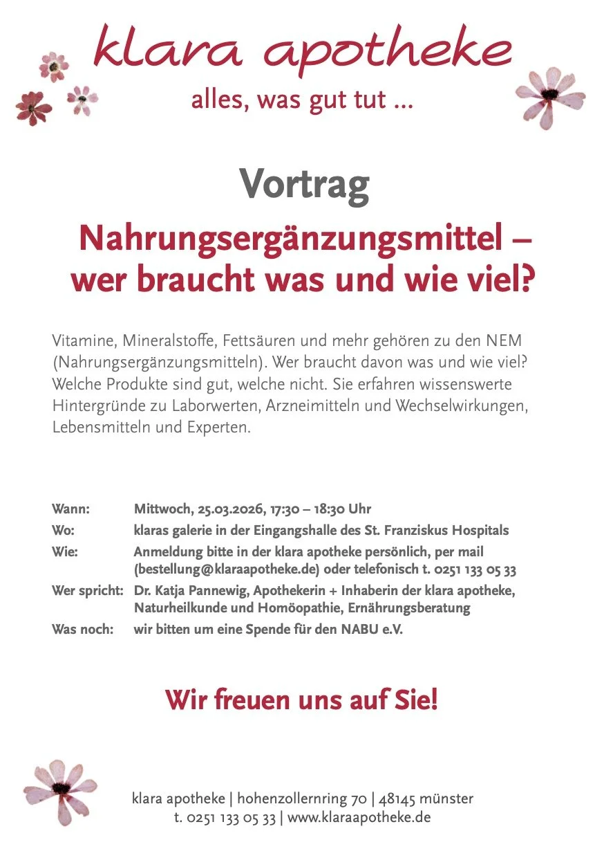 Im nächsten Vortrag Ende März geht es um NEM´s, das sind Nahrungsergänzungsmittel. Damit sind Vitamine, Mineralstoffe, Spurenelemente und mehr gemeint. Welche Produkte sind sinnvoll und woher weiß ich, was mein Körper braucht? Dazu gibt es Gesundes zum Probieren und Testen. Wir freuen uns auf Ihre Anmeldung!